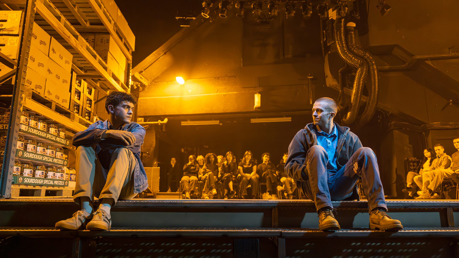 The stage at the Trafalgar Theatre has been transformed into a Costco warehouse. Metal racks stacked with giant tubs of crisps and treats and glowing televisions stretch across the space, while an audience bank sits opposite, faces lit in the same harsh fluorescent glow as the actors. It is here, amid the endless jars of pretzels and cheese balls, that two young men come together. The setting is plainly ordinary, yet Samuel D. Hunter’s play searches for tenderness inside its fluorescent corridors.