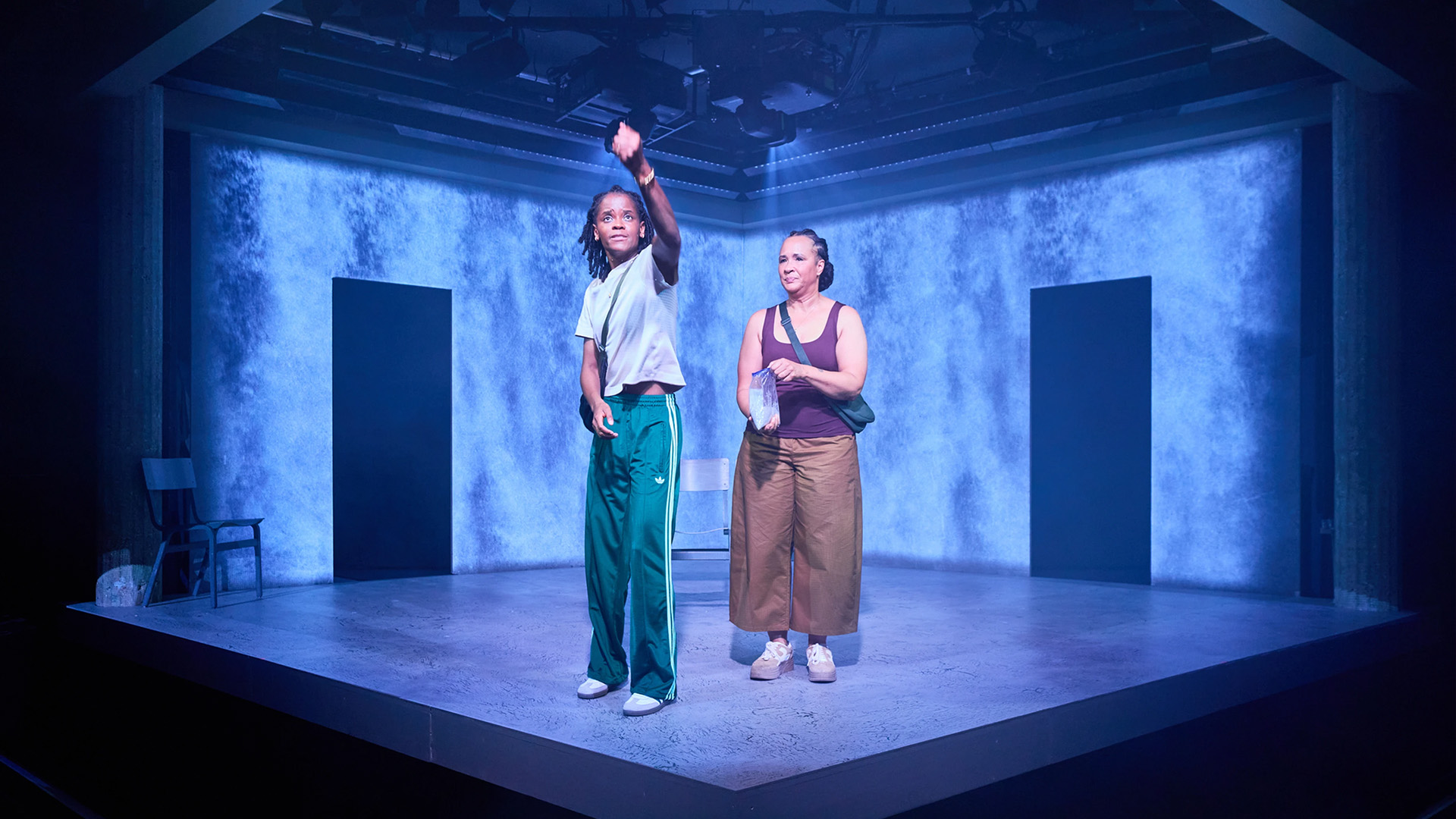 The staging is simple but alive with texture. Alex Berry’s stripped-back set leaves space for Gino Ricardo Green’s video design, which shifts us from the cramped cabin of a plane to Guyana’s waterfalls and family kitchens. Jai Morjaria’s lighting and Max Pappenheim’s sound design bring warmth and rhythm to these shifts, so that memory and present day blur into one continuous conversation. The effect is not grand or glossy, but it feels right for this space: intimate, inventive, and rooted in the characters.